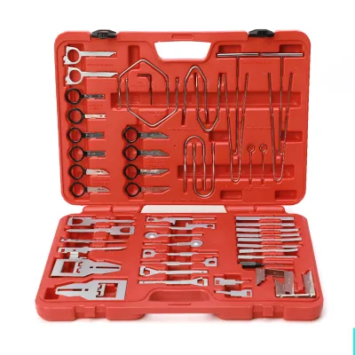 Unverzichtbare Werkzeuge für den Aus- und Einbau von Autoradios, einschließlich einer großen Auswahl an U-Haken und Spezialwerkzeugen, die häufig verwendet werden.